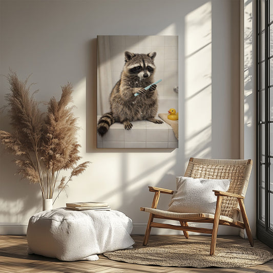 Raccoon Brushing Teeth in Bathtub Bathroom Wall Art Canvas