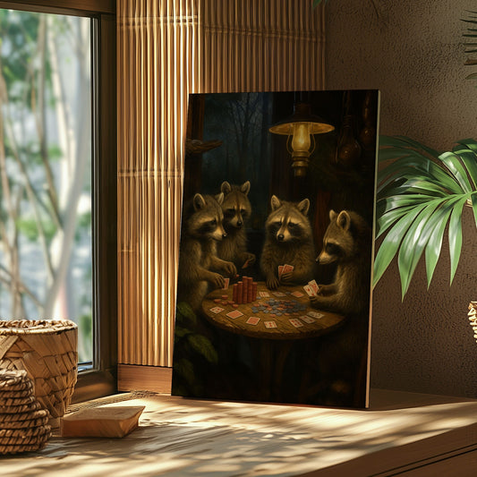 Raccoon Poker Night Canvas β Rustic Cabin Wall Art for Hunters