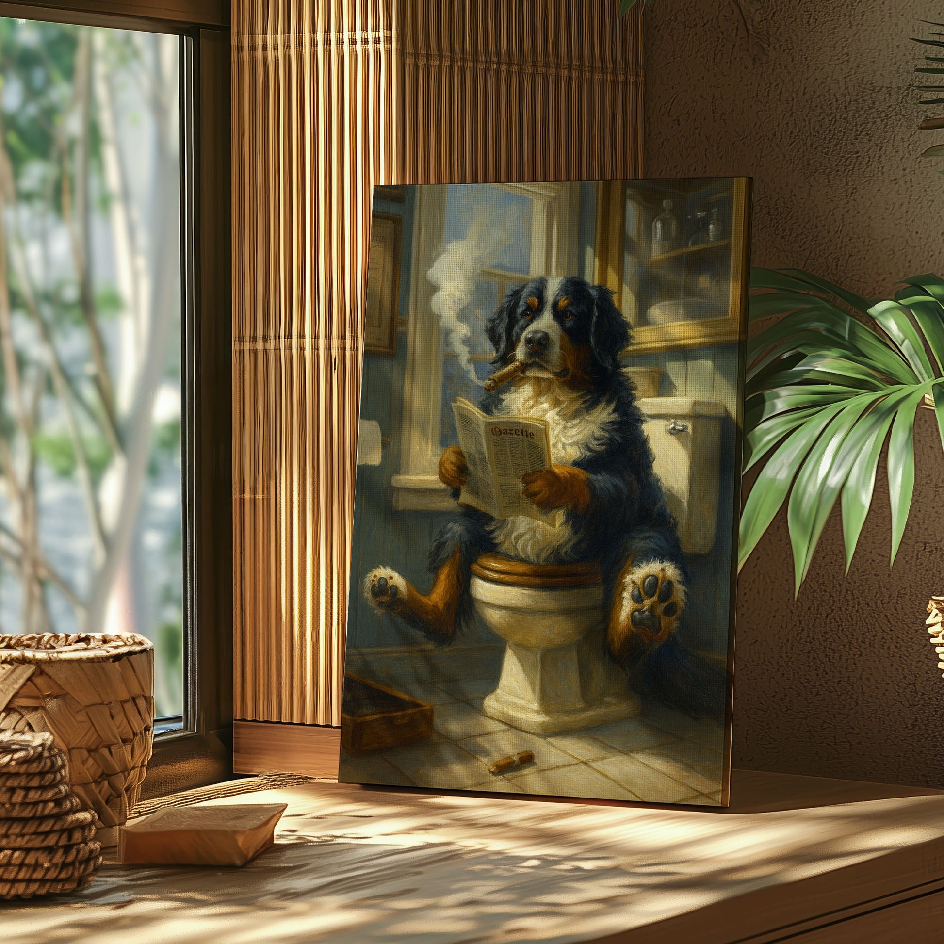 Bernese Mountain Dog Reading Newspaper with Cigar Canvas