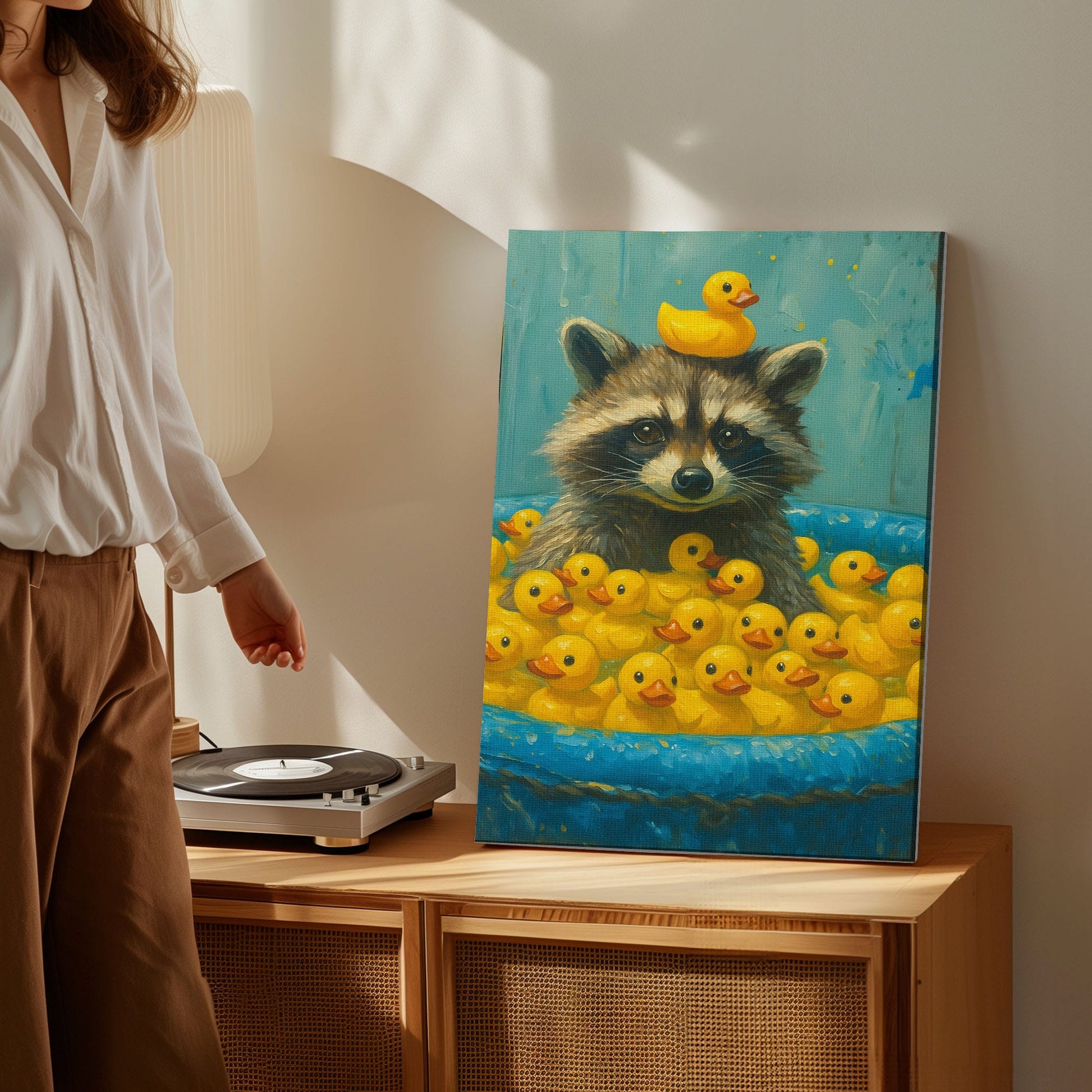 Cute Raccoon & Rubber Ducks Canvas – Funny Bathroom Wall Art