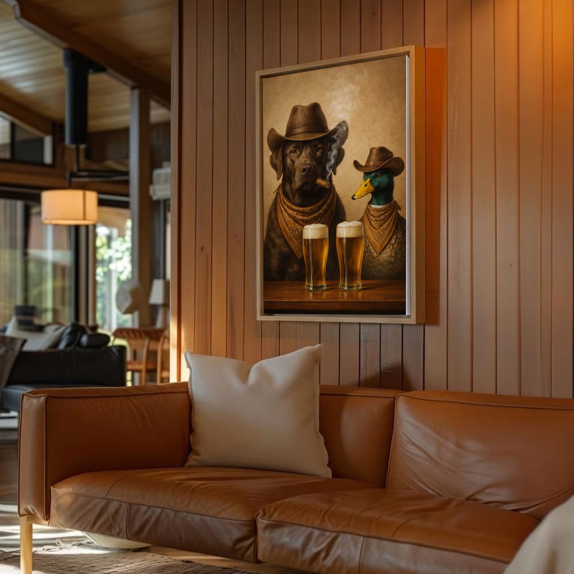 Dog and Duck Smoking Cigar Cold Beer Wall Art Gift for Hunters Cabin Decor