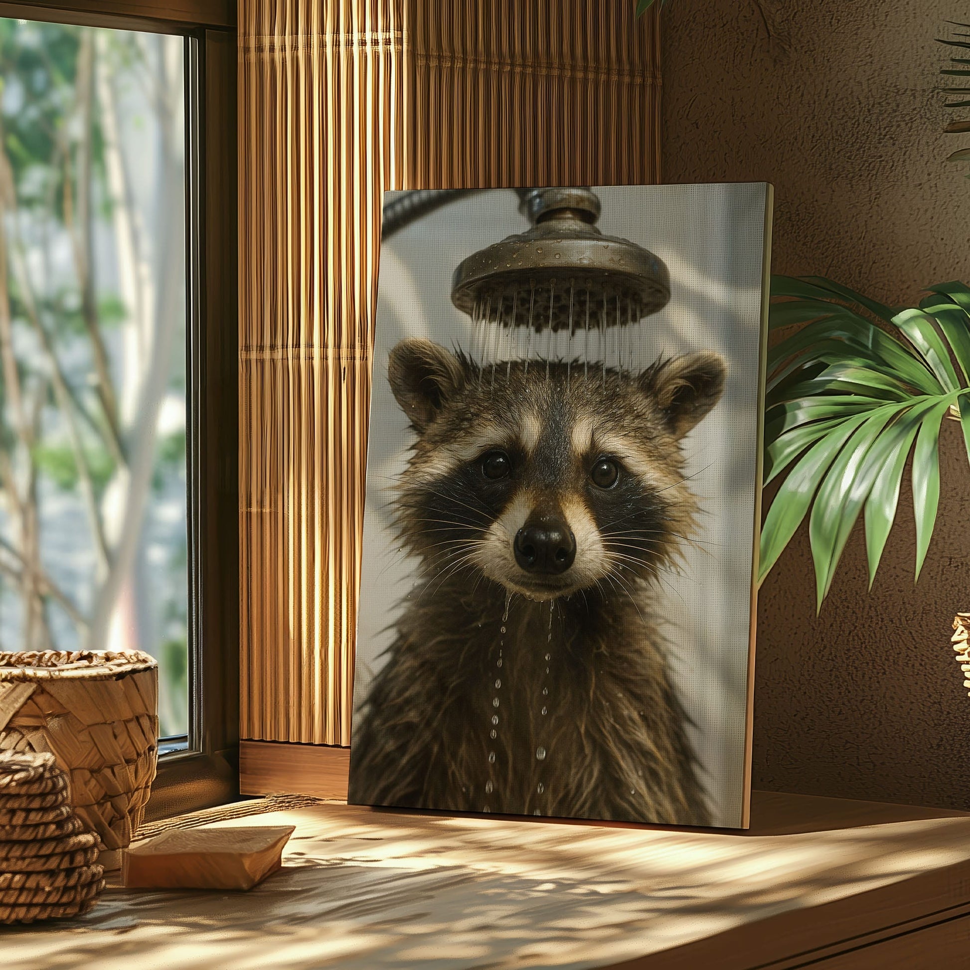 Funny Raccoon Shower Canvas – Rustic Bathroom Wall Art for Hunters & Cabin Decor