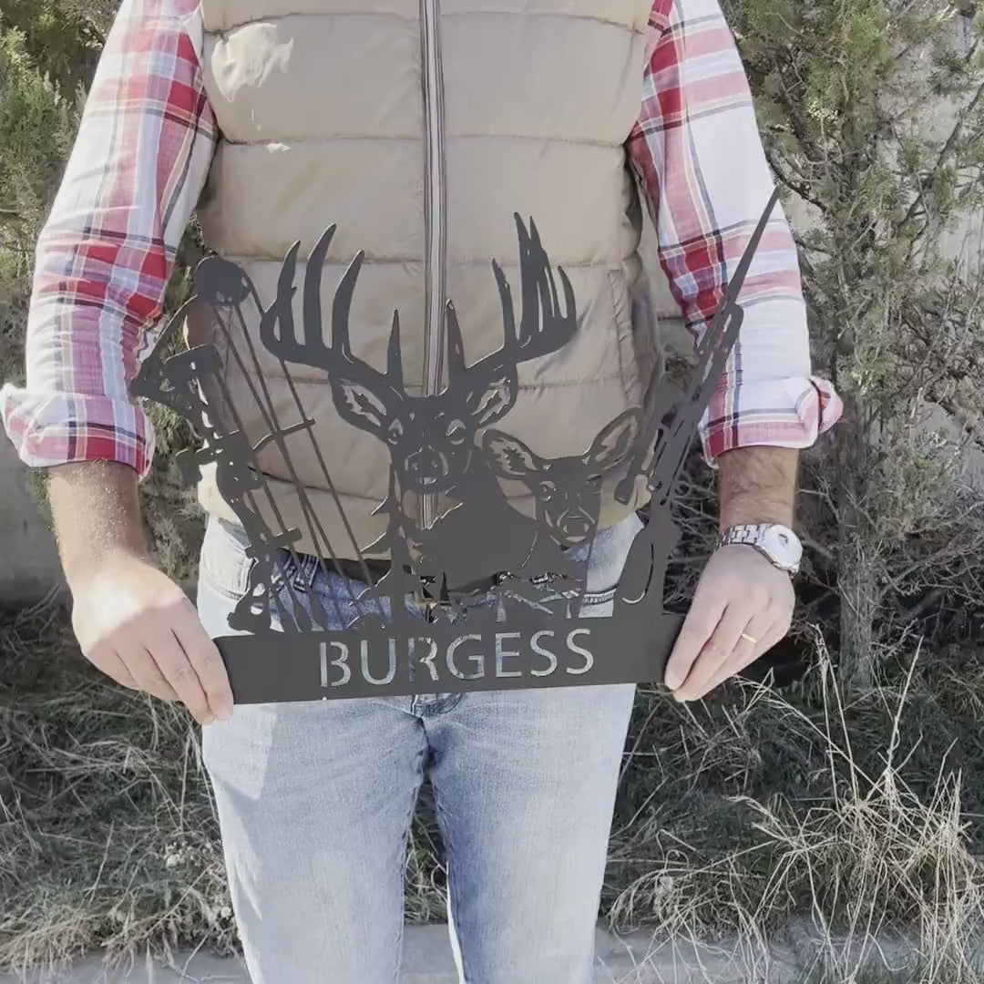 Personalized Deer Hunter Metal Wall Art, Custom Name Bow and Hunting Rifle Sign