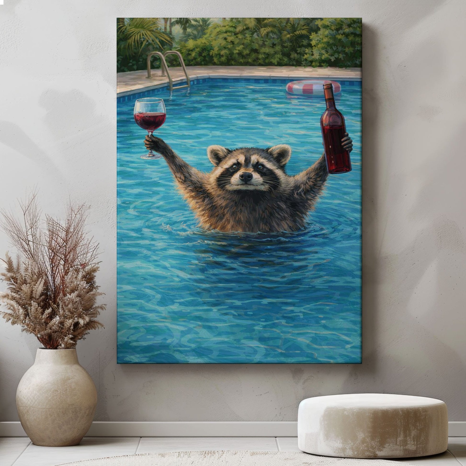 Raccoon Drinking Wine in Swimming Pool Wall Art Gift for Hunters Cabin Decor