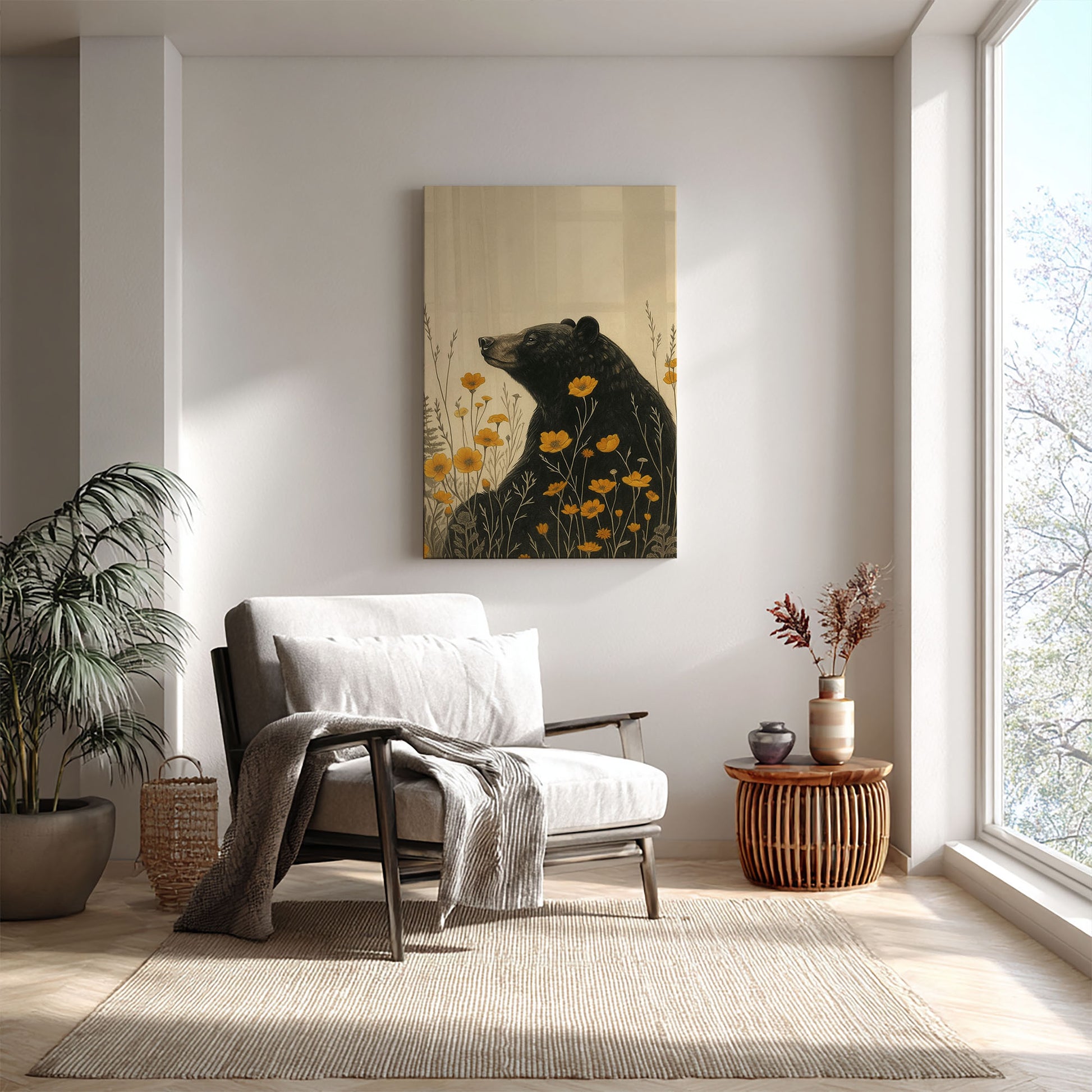 Rustic Bear Canvas Wall Art – Wildlife Flower Meadow Decor