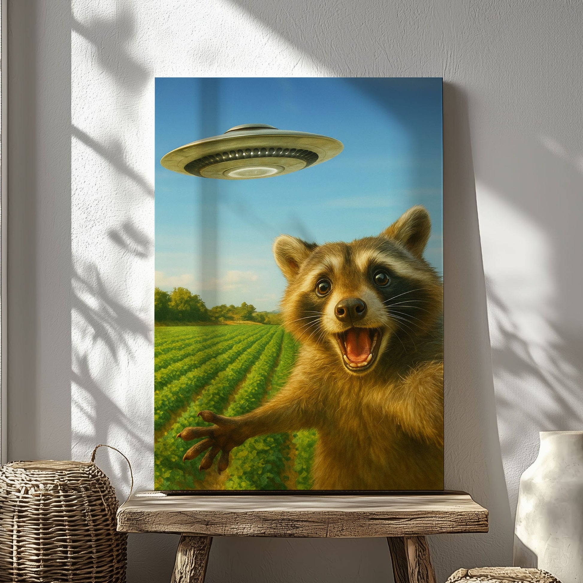 UFO Raccoon Canvas – Funny Alien Encounter Wall Art